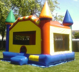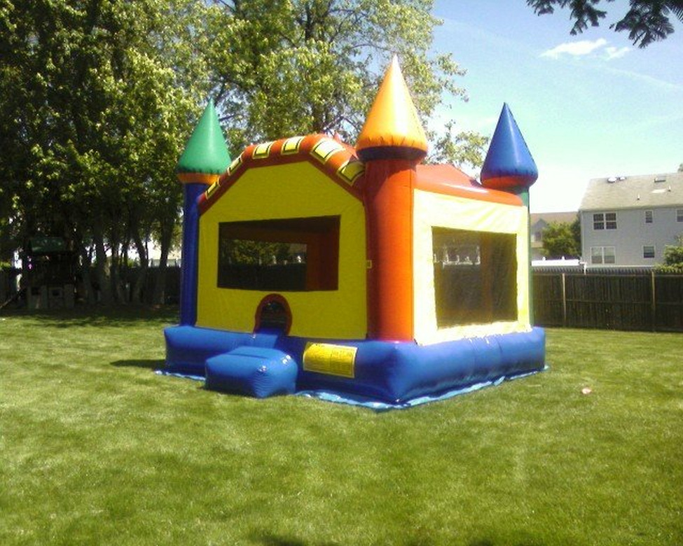 This majestic moonwalk is fit for any young king or queen, with colors of blue, green, red, yellow and orange, along with four tall spires to make any party a success.